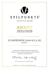 Auszeichnung 2022/2023 sowie 2023/2024 und 2024/2025. Die Firma Schwebewerk® GmbH & Co. KG wurde nach STILPUNKTE®- Kriterien geprüft und als Premium Partner ausgezeichnet und gehört somit zu den besten Adressen in Deutschland.